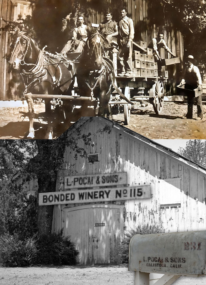 In 1912, the Pocai family applied for the 115th winery bond in Napa Valley and named their winery L. Pocai & Sons. The winery and vineyard were the family’s livelihood. They raised grapes and delivered them to the train station in a horse-drawn wagon. The wines they made were aged in oak and redwood barrels. Charles Krug in St Helena also purchased wine from their winery. At its peak, L. Pocai & Sons produced 50,000 gallons of wine.