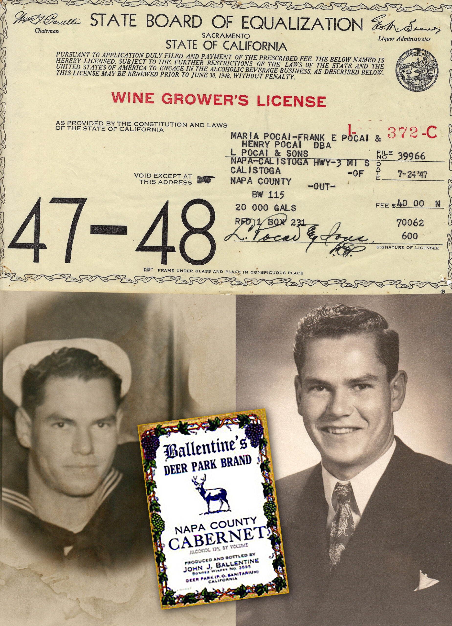 John was among the first to apply for a winery bond when prohibition was repealed in 1933. After receiving Bond #3533, he produced his inaugural wine, a Cabernet Sauvignon, among the first in Napa Valley. With a 65,000-gallon capacity, he also produced Zinfandel and Riesling under Ballentine’s Deer Park Winery. During this time, John Ballentine was the first to suggest to Robert Mondavi that their family should consider reviving Charles Krug’s pioneer stone winery.